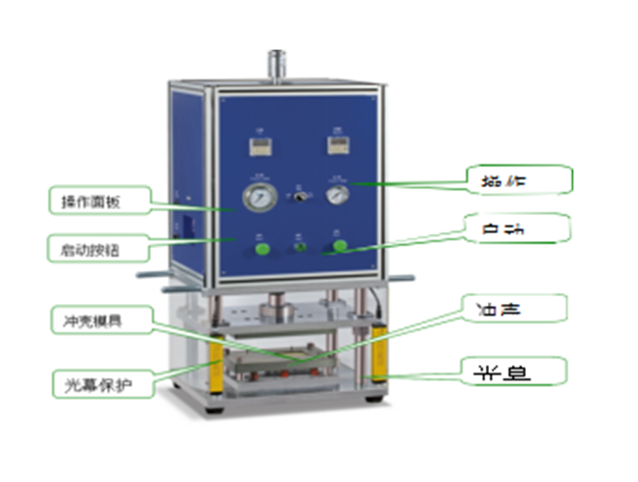 將切好的鋁塑膜片放入模具內(nèi)定位,然后按下起動按鈕,動力源驅(qū)動模具將鋁塑膜自動沖殼成型,取出鋁塑膜即完成。、