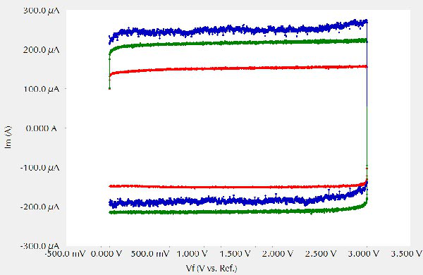 電流量程的重要性在圖2中突出體現(xiàn),圖2顯示了三條使用不同電流量程掃描的電容器的循環(huán)伏安曲線。綠色的曲線是用一個(gè)合適的I/E范圍測(cè)試的。通過選擇一個(gè)稍不敏感的I/E范圍(藍(lán)色曲線),信號(hào)噪聲變得非常明顯。不過過度敏感的電流量程(紅色曲線)會(huì)去掉曲線的某些峰。電化學(xué)工作站不能夠測(cè)量更高的電流。Gamry的軟件將此顯示為電流過載信號(hào)(I OVLD)。