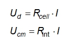 電流自對(duì)電極流入電解池到工作電極。在電解池上的電壓降由電阻Rcell和因電解池電纜和電路板布局引起的電阻(Rint)來表示。兩個(gè)電壓如下所示: