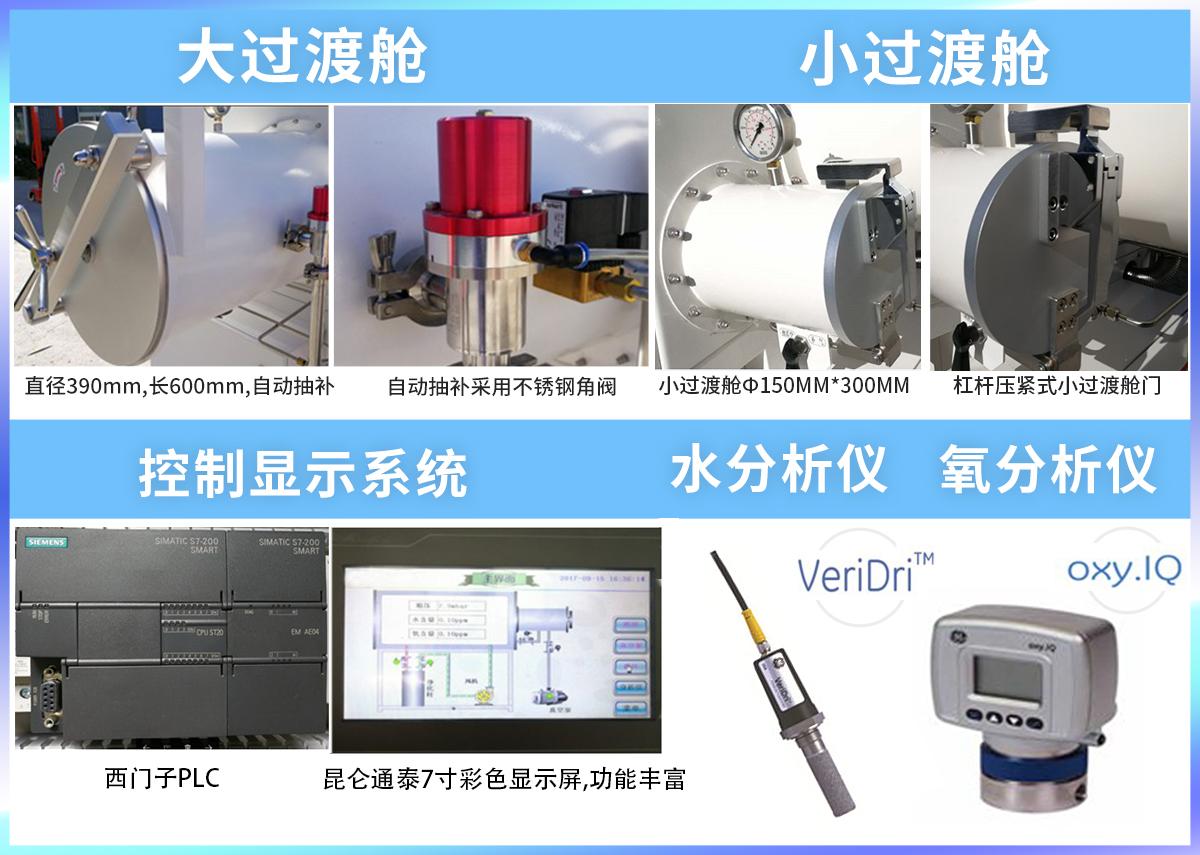 大過渡艙手動開閉,具有自動抽氣補氣功能,通過觸摸屏控制。 小過渡艙手動開閉,三通球閥手動操作抽氣補氣 |